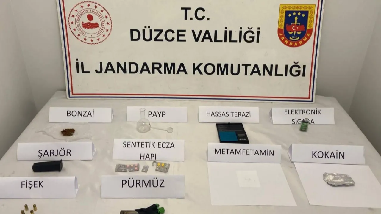 Düzce’de uyuşturucu ticareti yaptığı belirlenen M.K.’nin evinde yapılan aramada çeşitli uyuşturucular ve malzemeler ele geçirildi; şüpheli tutuklandı.Sefer DEMİR / DÜZCE (İGFA) - Düzce Cumhuriyet Başsavcılığı koordinesinde, Narkotik Suçlarla Mücadele (NSM) Şube Müdürlüğü ekipleri, Merkez ilçeye bağlı Mergiç Mahallesi’nde uyuşturucu ticareti yaptığı tespit edilen M.K.’nın ikametinde arama yaptı.