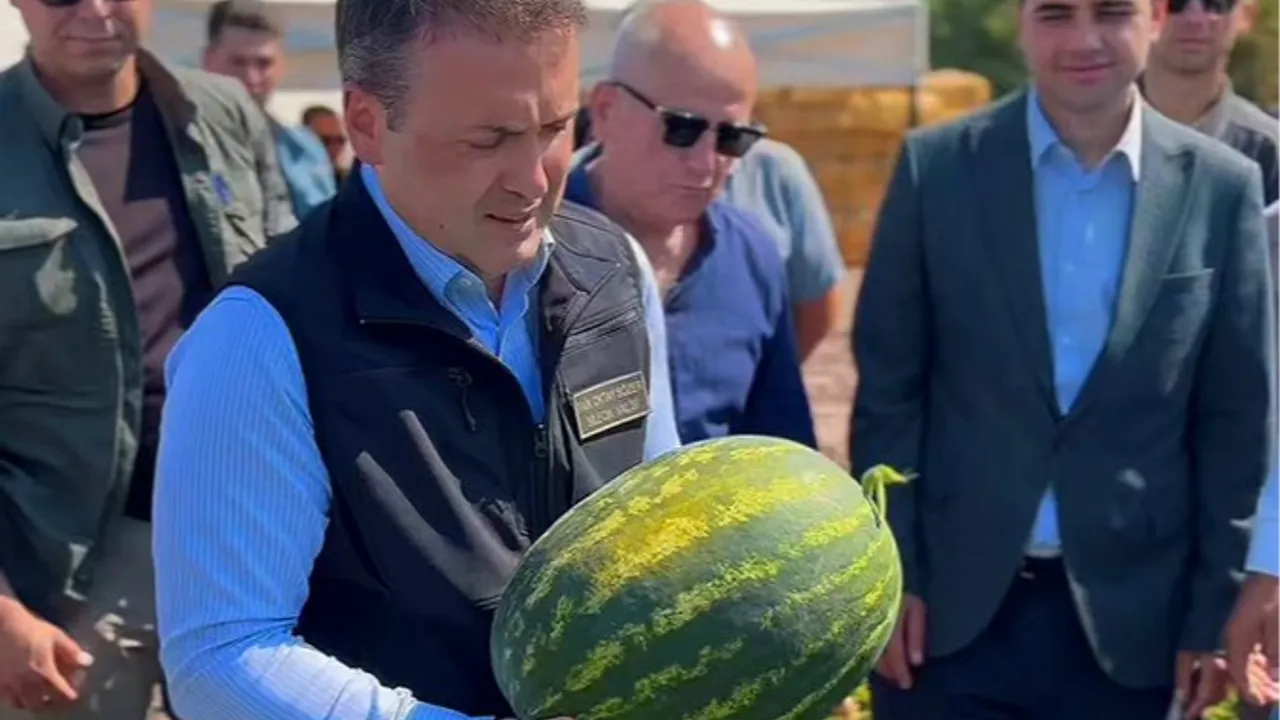 Karpuz hasadına katılan Vali Sözer, yetiştirilen karpuzlardan birini keserek, ikram etti.
